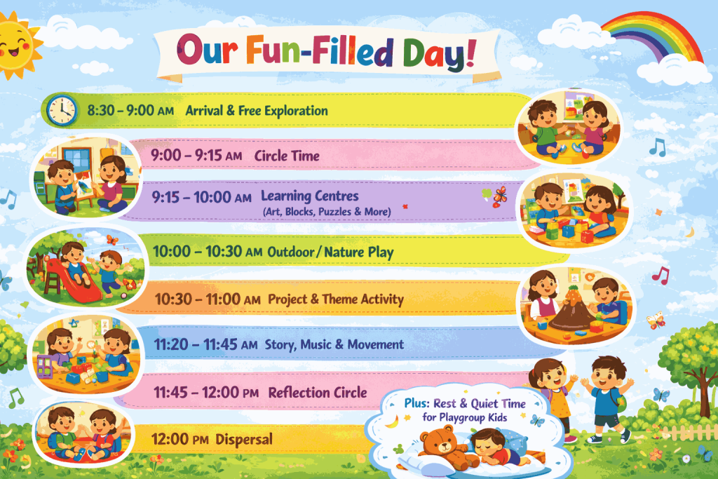 A daily rhythm that balances flexibility with predictable structure: Schedule Playgroup includes an optional rest/quiet time.